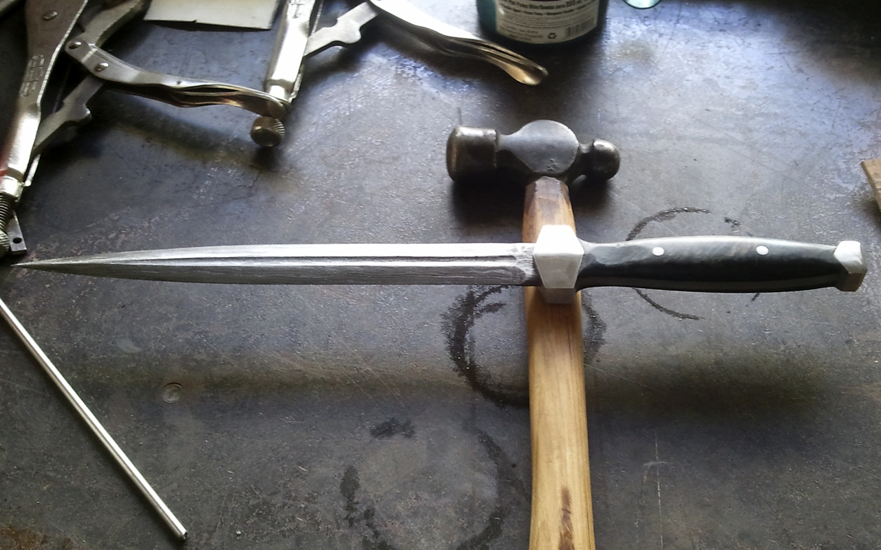 So for Christmas I decided to make my brother a damascus steel dagger. A follow up to my first knife making process which yielded a beautiful first attempt at knife making. I'd go so far as to say this attempt blew that one out of the water like a damascus torpedo fired from a damascus submarine. Below I've outlined the processes involved in making the knife. Click through the images in gallery view for a full description. Sorry for the picture quality, I normally just took a picture of the knife with my phone when I was done working on it for the day.