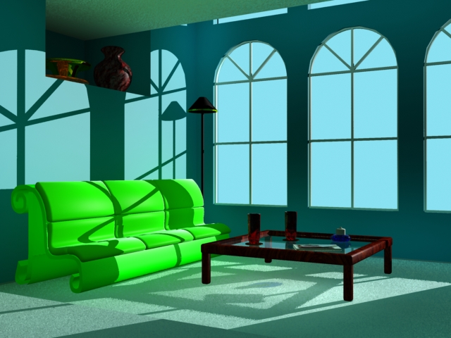 room9 July 7, 2003 Studio Max, Brazil Rendering I wanted to make a cool couch, so I put it in a cool room... then bounced some light. |