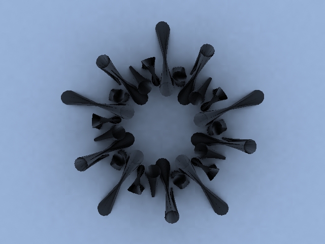 Not6 August 29, 2003 Studio Max, Brazil Rendering Random knot, attempt to render glass and reflections with Brazil. |