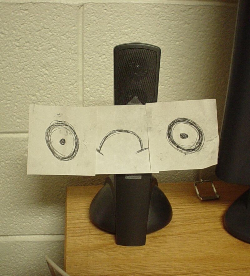 So my thermo homework was a joke... compaired to last semester oh my gosh... I feel like i should just go to the harder class for the hell of it. And the face popped up again, this time on my speaker. And my suite mate has acquired a digital cam corder!... thats gonna be interesting :)!