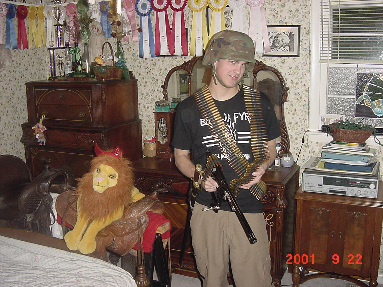 Well it all started out just a normal saturday morning, you know waking up and getting dressed, and what not. You know the normal. So I decided to have some friends over for a bar-b-q and some reading. While reading "The Real Mother Goose" me and Colin had a bit of a dispute over "Poose in Boots." Well that had to be recified, but Mike would not let me. So we had to finish this the old fashioned way... with a spanish knife fight. We'll just say that I got my way. -giggle- My bad. Well this did not fare well with my other friends so I had to bust me some caps yo. And you know all this makes me very tired, so I guess I fell asleep. Sunday morning... I got ready and went to church so its all good :) -waves-